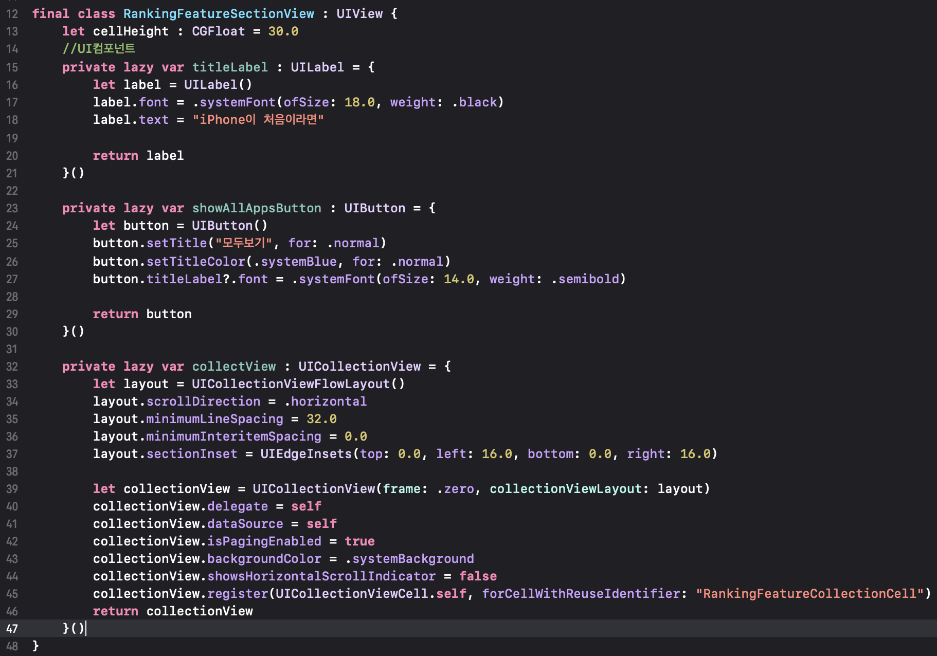 상단의 UILable과 모두보기 버튼의 헤더가 될 수 있지만 번거로움이 존재해서 UICollection뷰와 동등한 객체로 구현.