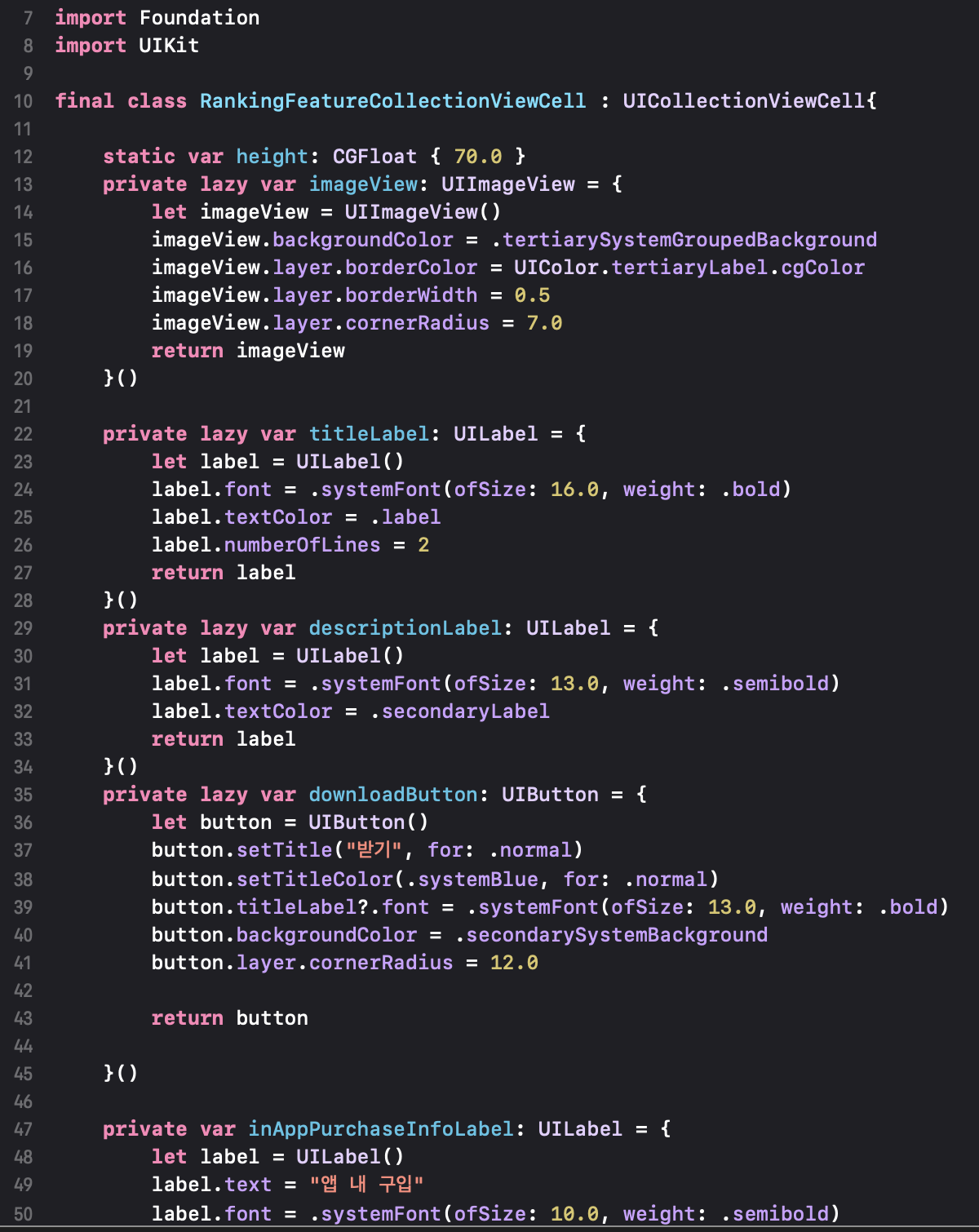 이번엔 랭킹피쳐 안의 커스텀셀을 만들겠습니다.