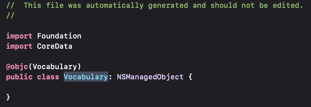 아래 코드에서 Vocabulary 클래스는 CoreData에서 제공하는 데이터를 표현하기 위한 유형의 NSManagedObject의 서브 클래스 입니다. 위 사진처럼 vocabulary 객체를 coredata에 추가하면 자동적으로 나오게 됩니다. 잠시후 아래에서 다시 자세히 보도록 하겠습니다.