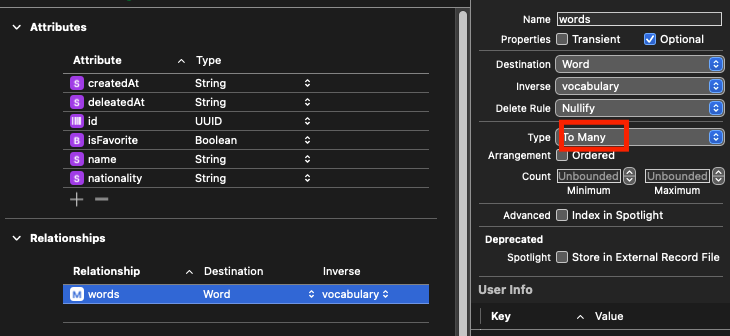 하나의 단어장 안에 다수의 단어가 들어가야하므로 Type을 To Many로 바꿔주어야합니다.
