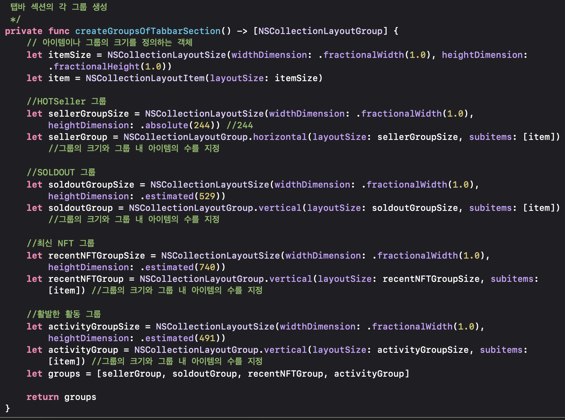 Compositional Layout부터는 섹션 안에서 구별되는 Group개념이 도입되어 더 세분화된 뷰를 쉽게 구현할 수 있습니다.