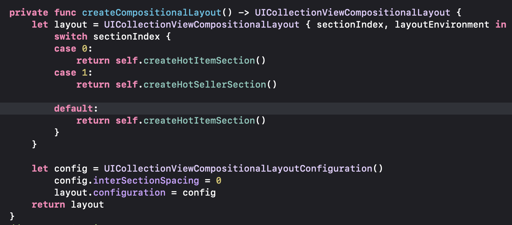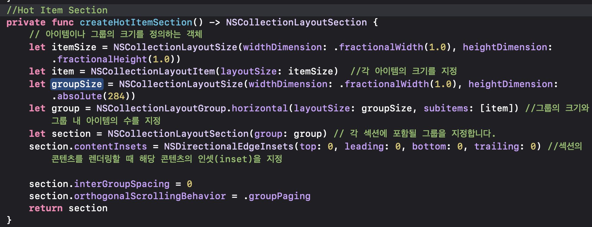 createHotItemSection() 및 createHotSellerSection() 메소드는 각각 Hot Item 및 Hot Seller 섹션의 레이아웃을 정의하는 NSCollectionLayoutSection 객체를 생성하고 반환합니다.