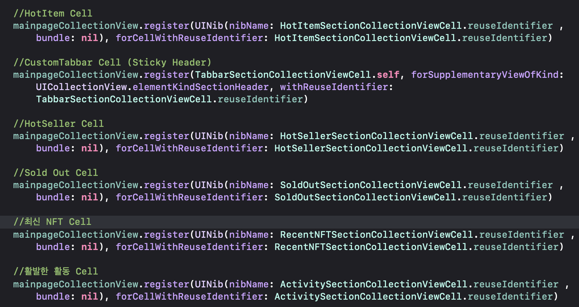 그리고 collectionView의 각 셀에 보여줄 Nib파일을 등록해줍니다.