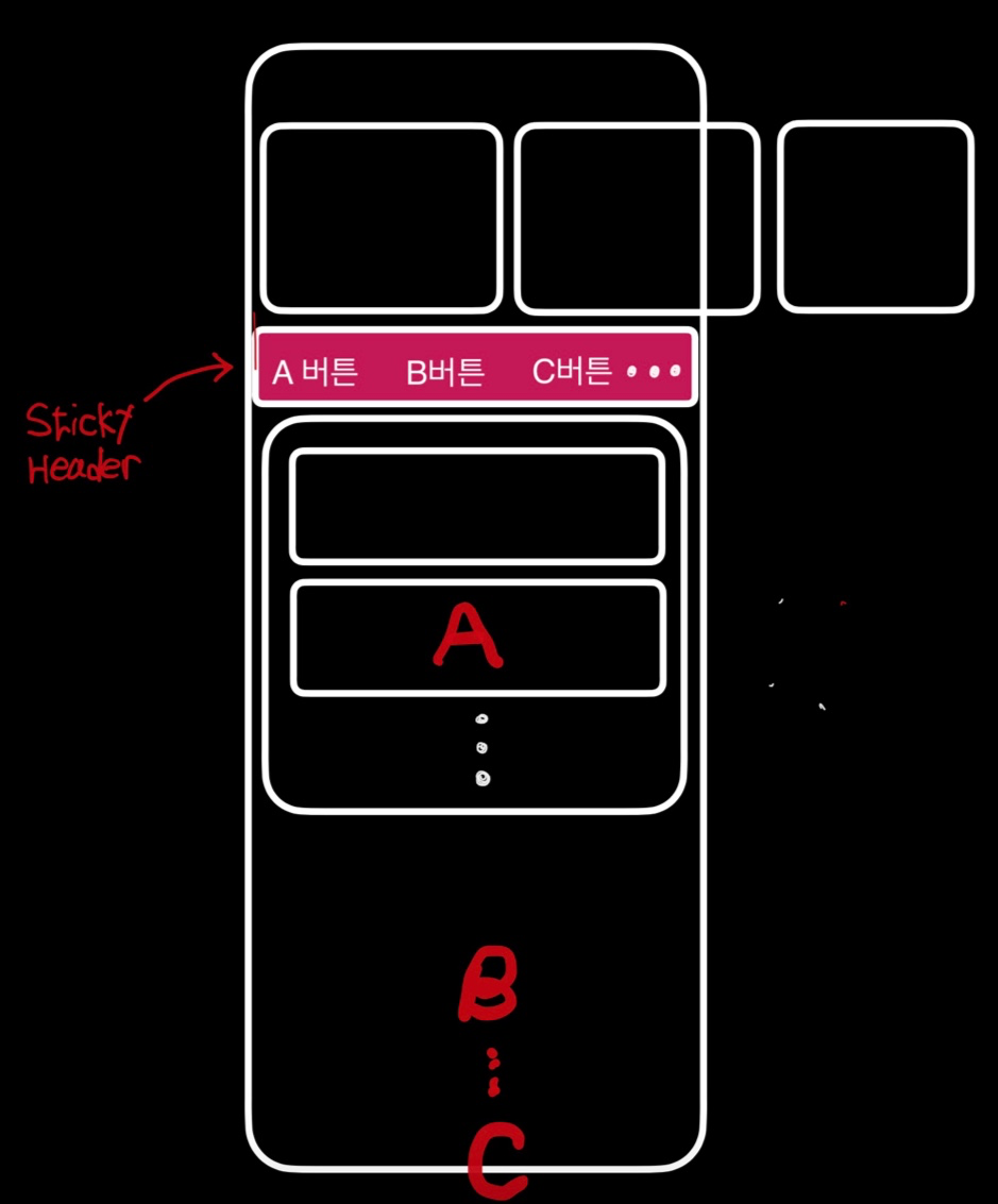 또한 중간에 Sticky Header형태의 탭바가 들어가 있어서 해당 섹션의 리스트가 보일때 탭바는 스크롤시 사라지지 않고 상단에 유지되어야합니다.