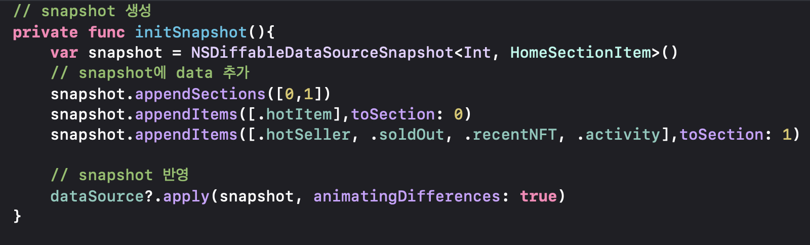 먼저 NSDiffableDataSourceSnapShot 클래스를 통해 빈 스냅샷을 만들고 원하는 섹션에 해당 아이템들을 append해주는 모습입니다.