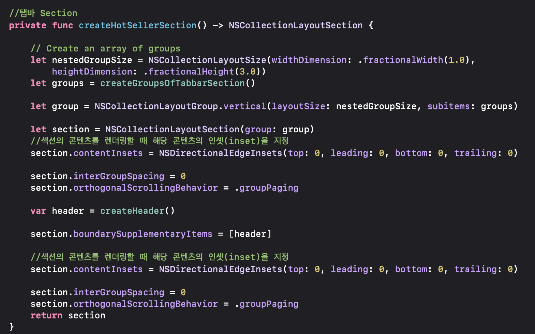 createHeader() 메서드는 Hot Seller 섹션에 대한 고정 헤더 보기를 정의하는 NSCollectionLayoutBoundarySupplementaryItem 객체를 생성하고 반환합니다.