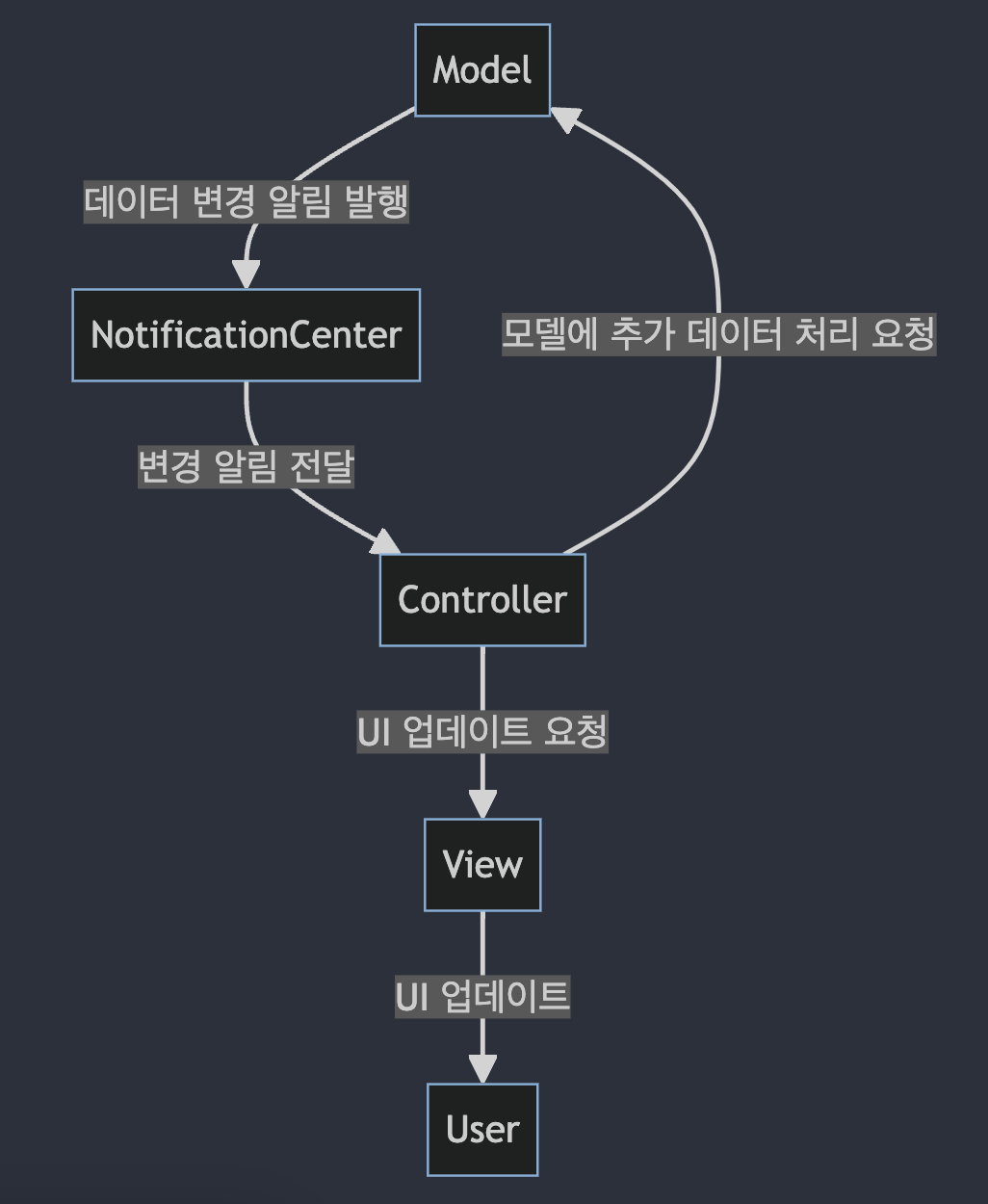 - 뷰와 컨트롤러 반응: 알림을 받은 뷰는 UI를 업데이트하고, 컨트롤러는 추가 데이터 처리를 시작할 수 있습니다.