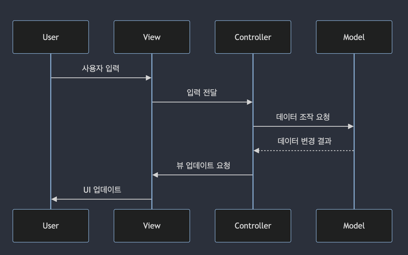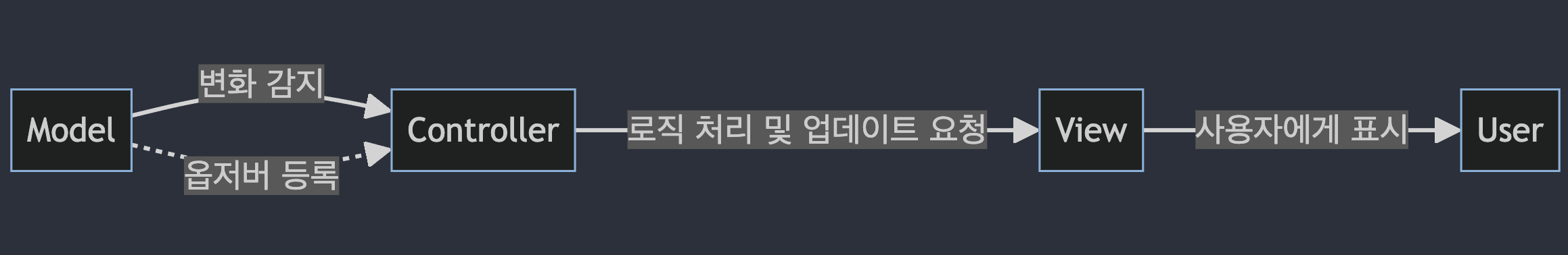 - 입력 흐름: 뷰에서 시작하여 사용자 입력을 컨트롤러에 전달하고, 컨트롤러는 이를 처리하여 모델의 데이터를 변경할 수 있습니다.