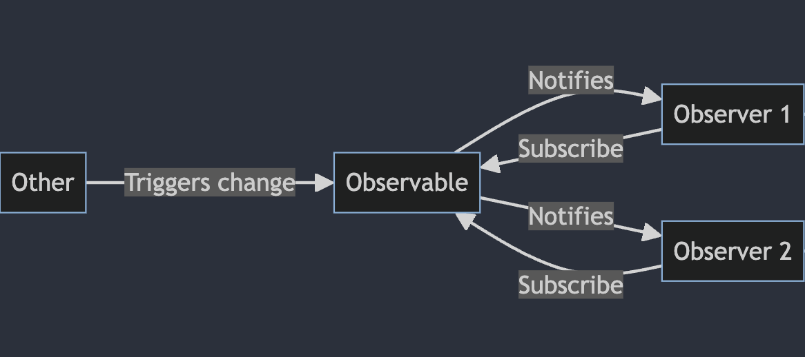 옵저버 패턴의 핵심은 "변화를 관찰하고자 하는 객체(observer)"와 "변화를 알려주는 객체(observable)"의 관계입니다. 옵저버는 자신을 구독자로 등록함으로써, observable 객체의 상태 변화를 실시간으로 알 수 있습니다.