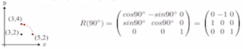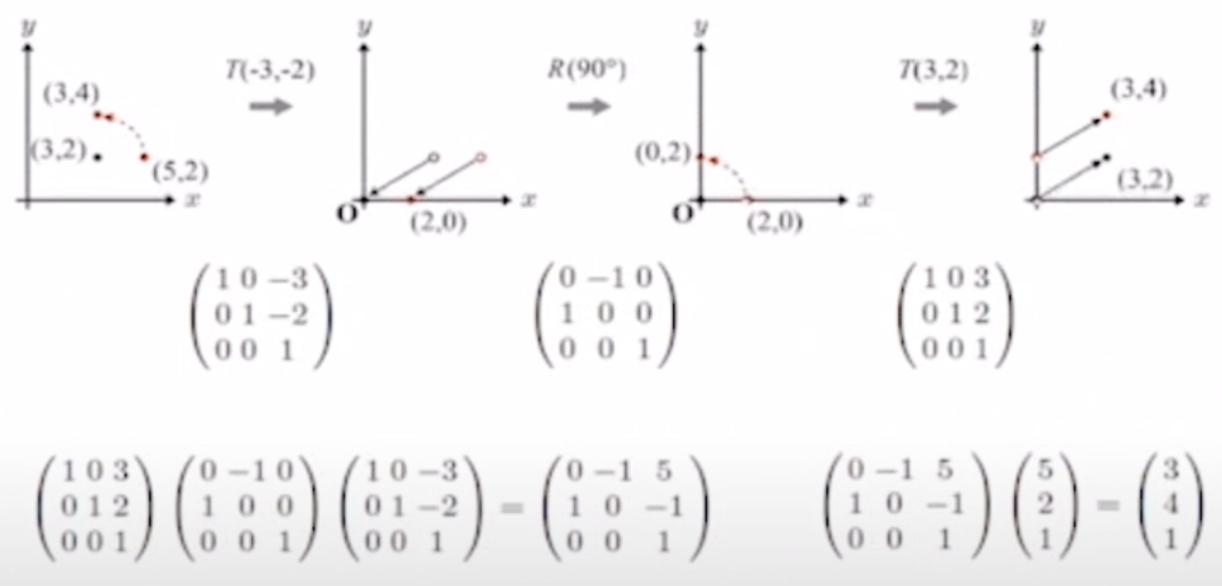 (5,2)좌표를 점(3,2)를 중심으로 90도 회전하는 예제를 보자.