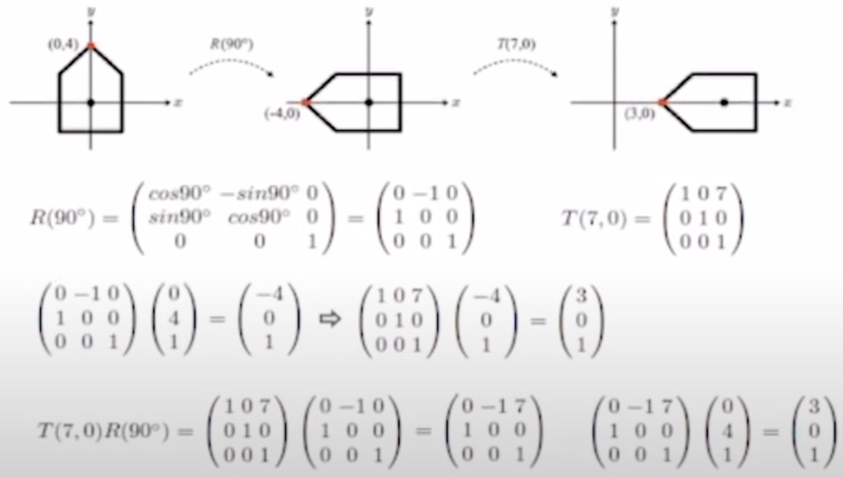 90도 회전 후 (7,0)변위 벡터를 따라 이동 시키는 예시는 다음과 같다.
