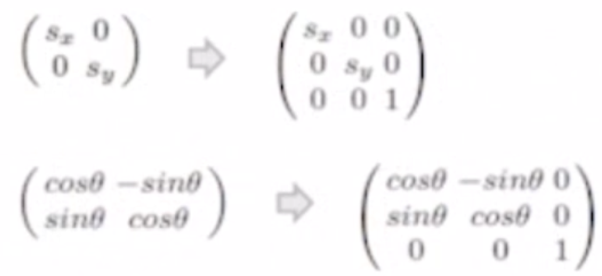 하지만 Scailing과 Rotation은 아직 2x2행렬이다. 이것 역시 통일성을 주어야한다.