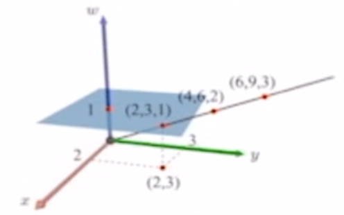 w좌표가 1인 곳에 하나의 평면을 생각할 수 있다. 그래서 2,3 이라는 cartesian 좌표가 있을 때, 그 좌표를 위로 평면으로 끌어올리면 (2,3,1) 동차 좌표가 만들어진다.
