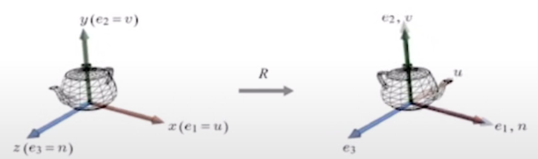 물체와 object space는 붙어서 간다. 그렇다면 원래 e1, e2, e3와 같았던 u,v,n이 달라졌다는 것이 보일것이다.