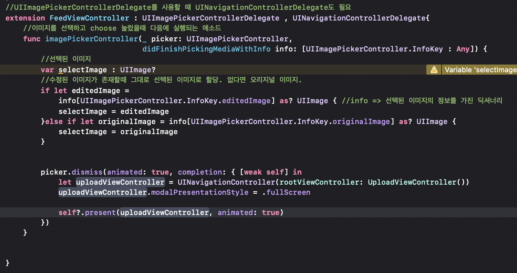 Choose를 누르면 ImagePicker뷰가 Dismiss되어야하고 게시물 작성 화면이 나오게 될 것입니다.