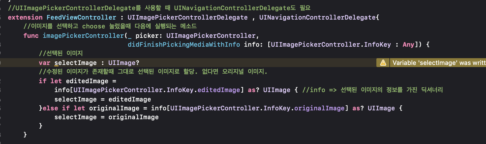 info[UIImagePickerController.InfoKey.editedImage] as? UIImage { //info => 선택된 이미지의 정보를 가진 딕셔너리