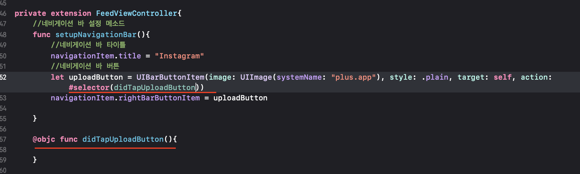 Right BarButton 적용할 액션 메소드를 추가해줍니다.