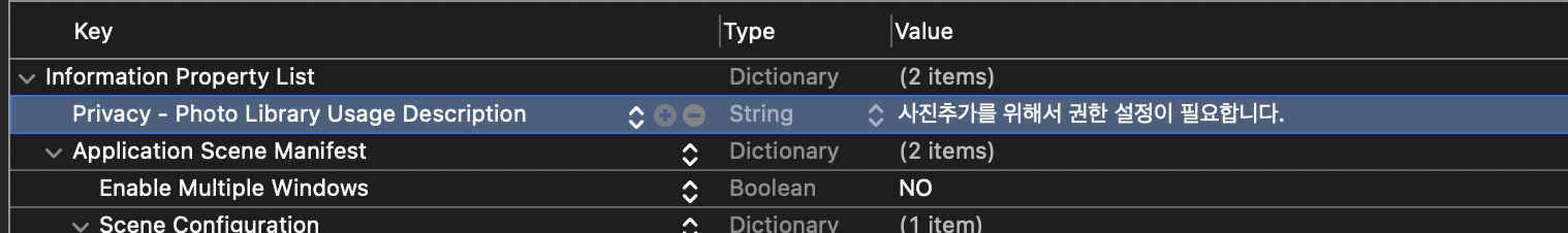 따라서 Plist에서 Photo Library Usage Description을 추가합니다.