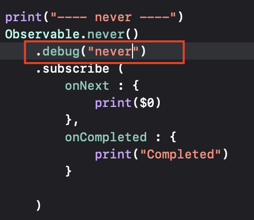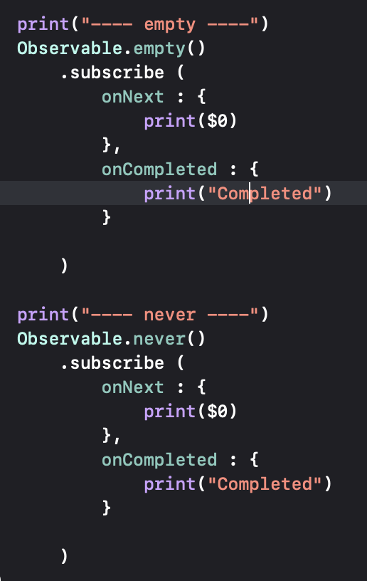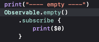 never의 출력결과를 보시면 empty연산자와 다르게 onCompleted이벤트 조차 출력이 안 되는 것을 알 수 있습니다.