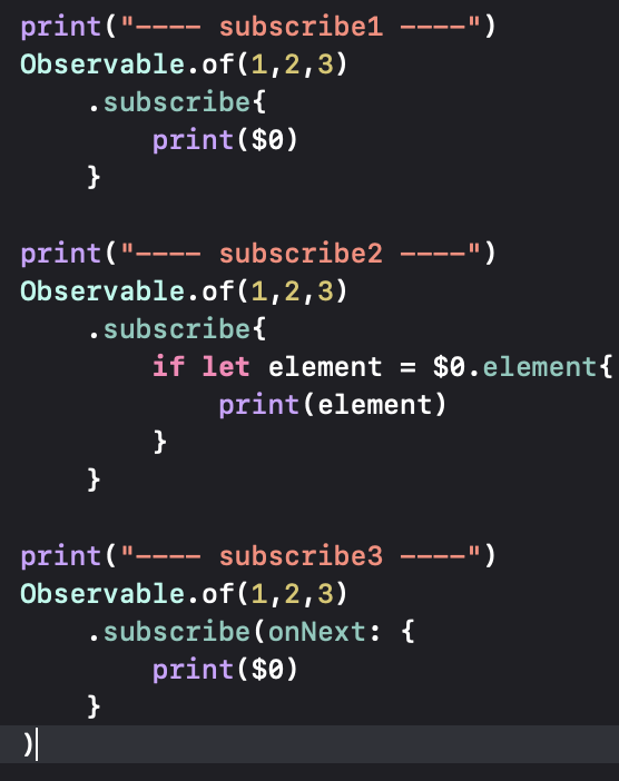 시퀀스 Observable<Int>가 Int(Element)를 next에 담아서 하나씩 방출할 때 이 Observable을 Observer들이 관찰하고 수신할 수 있게됩니다.