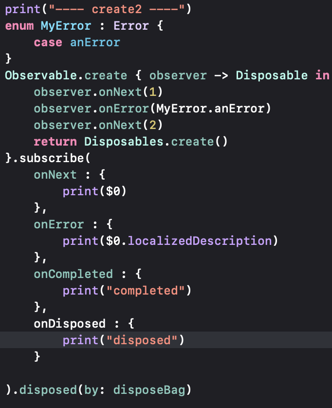 위 출력결과를 보면 onNext(2)의 이벤트는 그전에 onCompleted가 호출되어 Observable이 종료되었기에