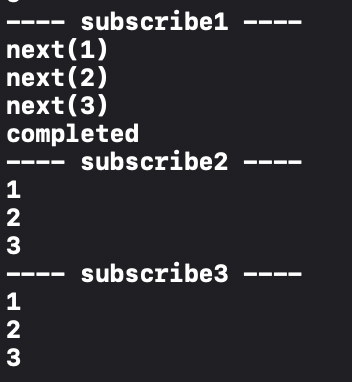 지금 Obervable은 시퀀스의 정의일 뿐 Observer에게 Subscribe되기 전에는 아무런 이벤트도 emit하지 않는다고 합니다.