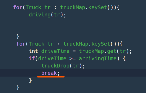 아래와 같이 트럭을 드롭시키면서 초당 나가는 트럭은 한대이므로 Map이 변경되어도 바로 반복문이 끝나므로 위 에러는 발생하지 않게됨.