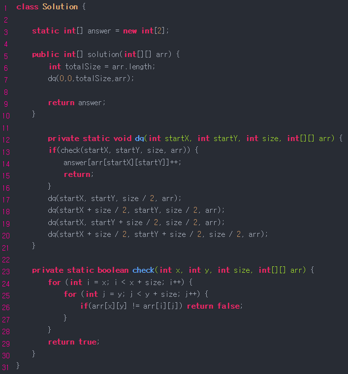 [프로그래머스] 쿼드압축 후 개수 세기 for JAVA 분할정복
