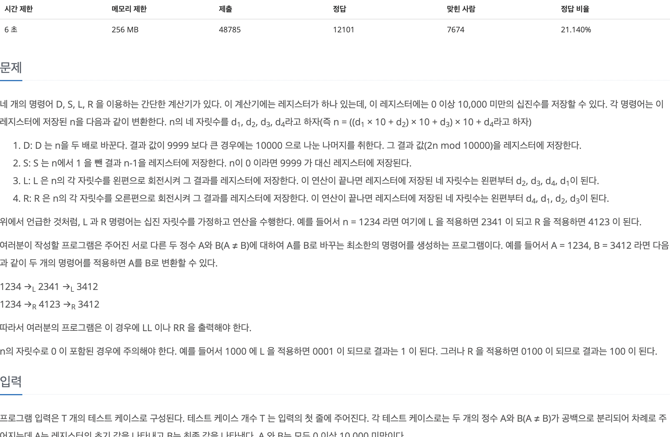 🔗 문제 링크 BOJ 9019번: DSLR 9019번: DSLR 네 개의 명령어 D, S, L, R 을 이용하는 간단한 계산기가 있다. 이 계산기에는 레지스터가 하나 있는데, 이 레지스터에는 0 이상 10,000 미만의 십진수를 저장할