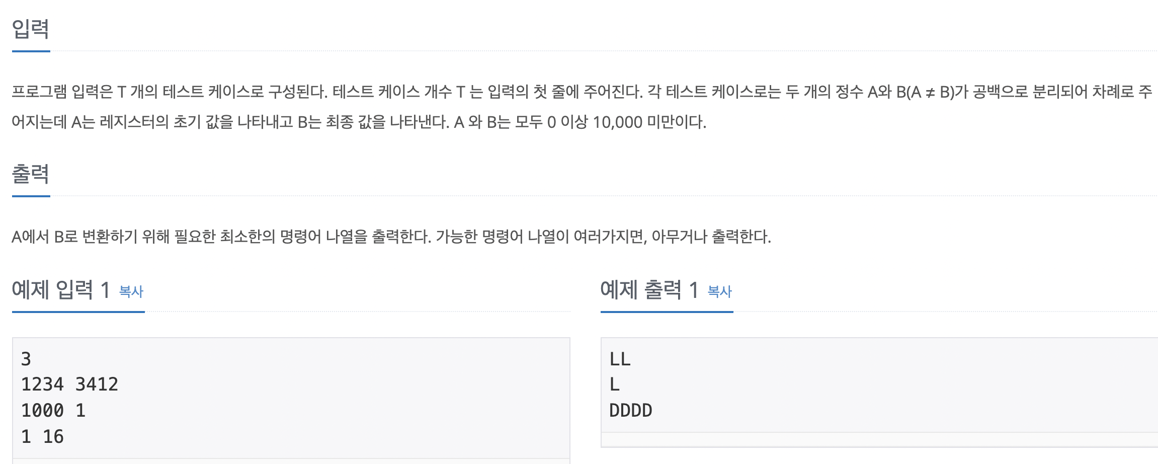 문제 출처 https://www.acmicpc.net/problem/9019 9019번: DSLR 문제 네 개의 명령어 D, S, L, R 을 이용하는 간단한 계산기가 있다. 이 계산기에는 레지스터가 하나 있는데, 이 레지스터에는 0 이상 10,000 미만..