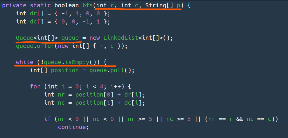 맨 하단에 전체 코드가 있습니다. [ 문제 풀이 ] - 대기실의 모든 자리를 탐색하면서 모든 P를 찾는다. - 모든 'P'에 대해서 거리두기를 만족하는지 확인한다. => bfs이용!! 바로 옆에 'P'가 오지 않거