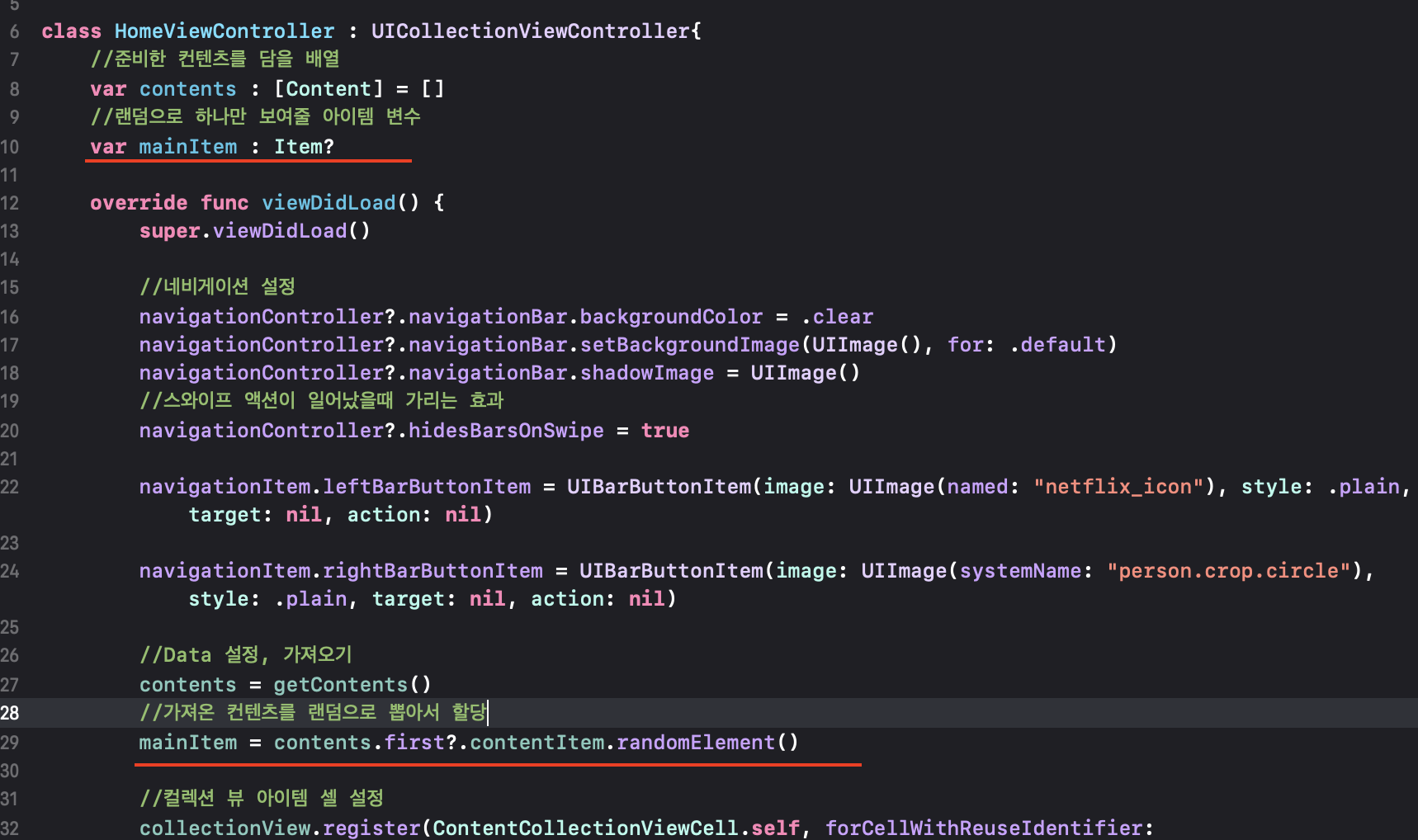이제 컨텐츠 아이템들중 하나만 랜덤으로 메인셀에 표시하겠습니다.