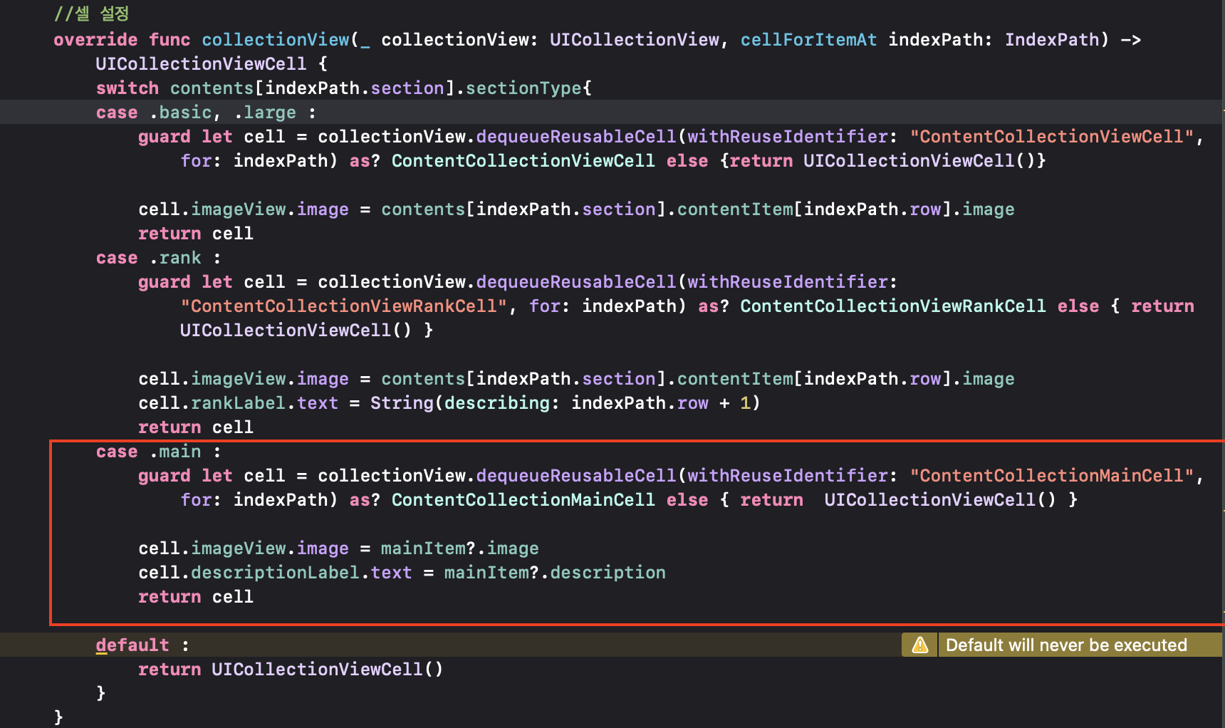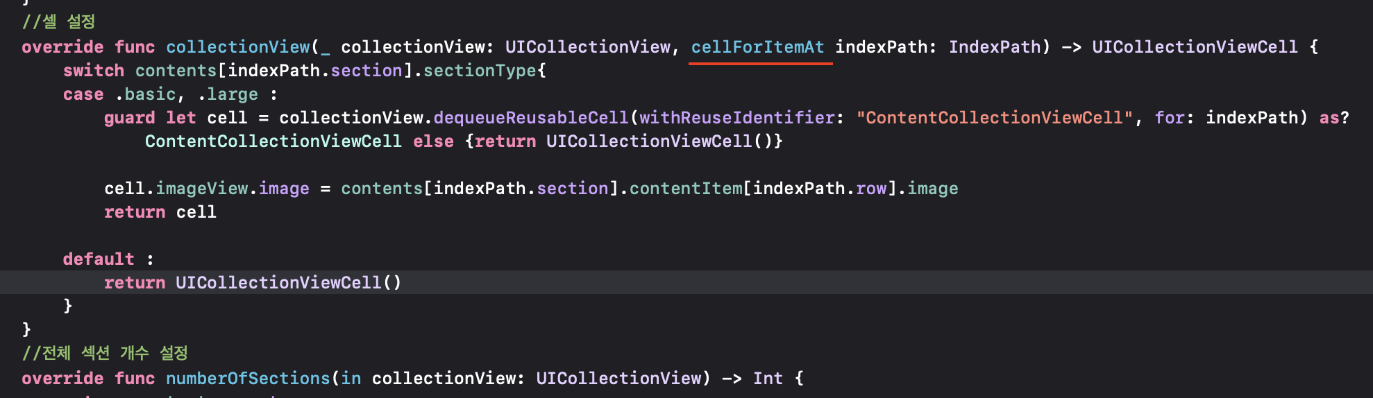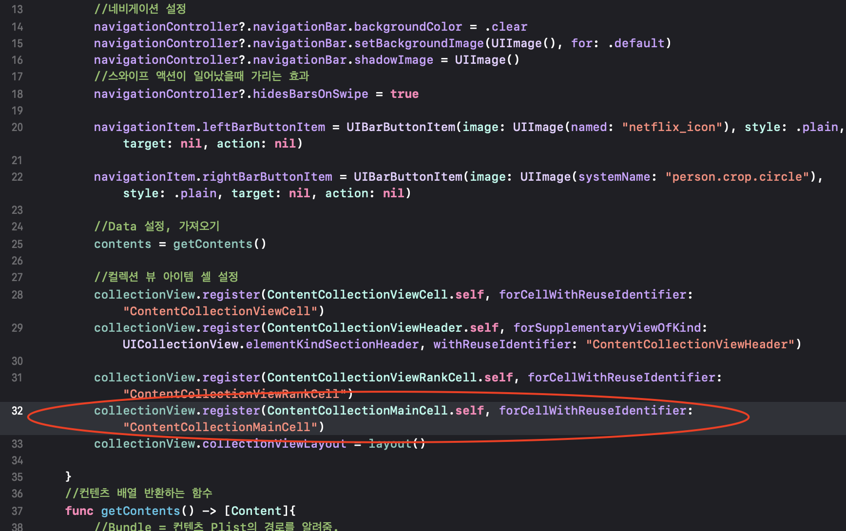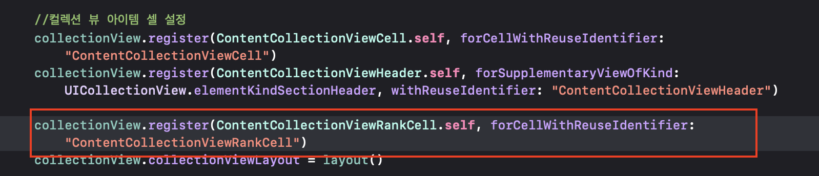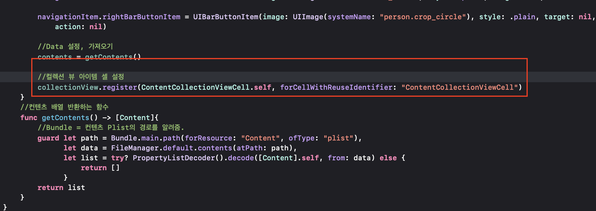 이제 설정한 메인셀을 컬렉션뷰에 등록시킵니다.