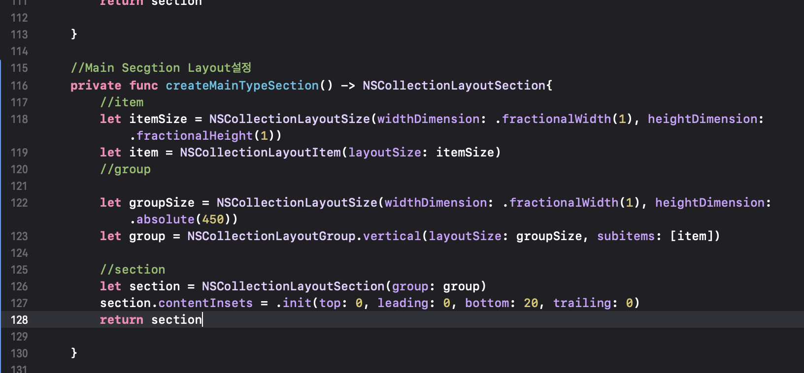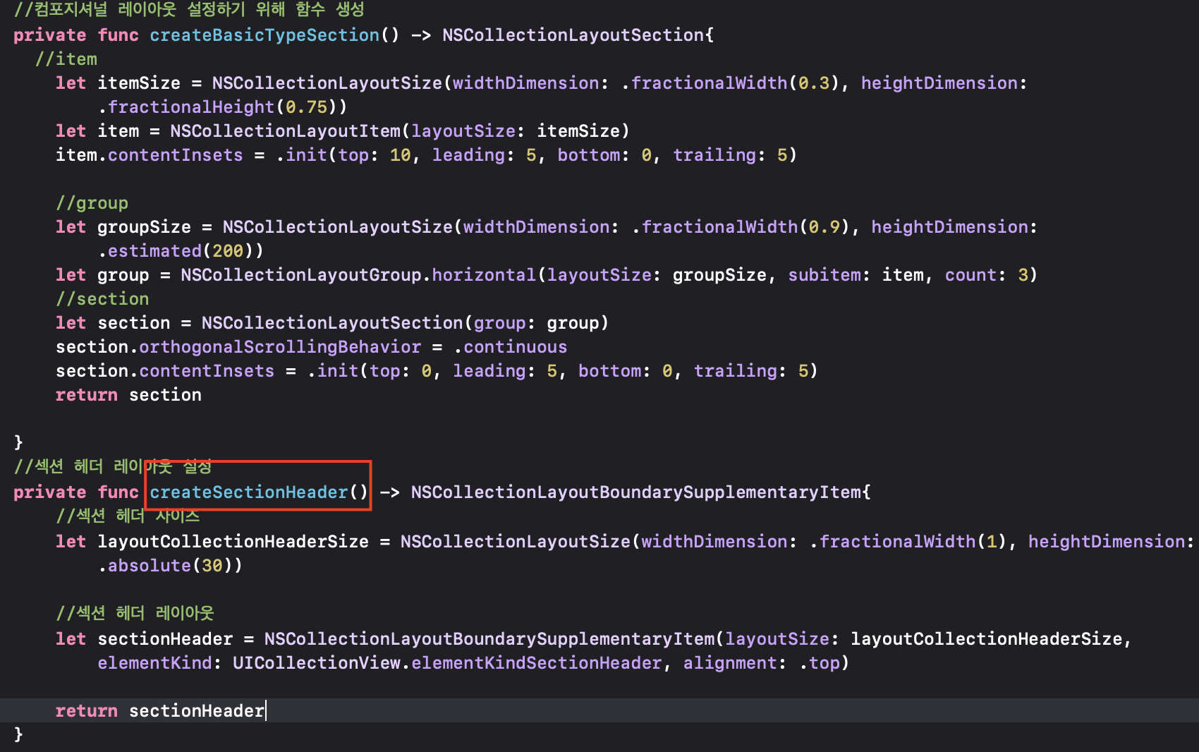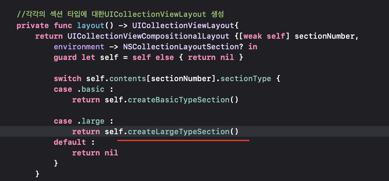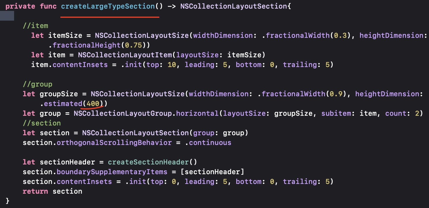 이렇게 베이직과는 거의 비슷하지만 그룹의 사이즈와 설정만 다르게 Large타입의 섹션을 만들어주는 함수를 선언합니다.