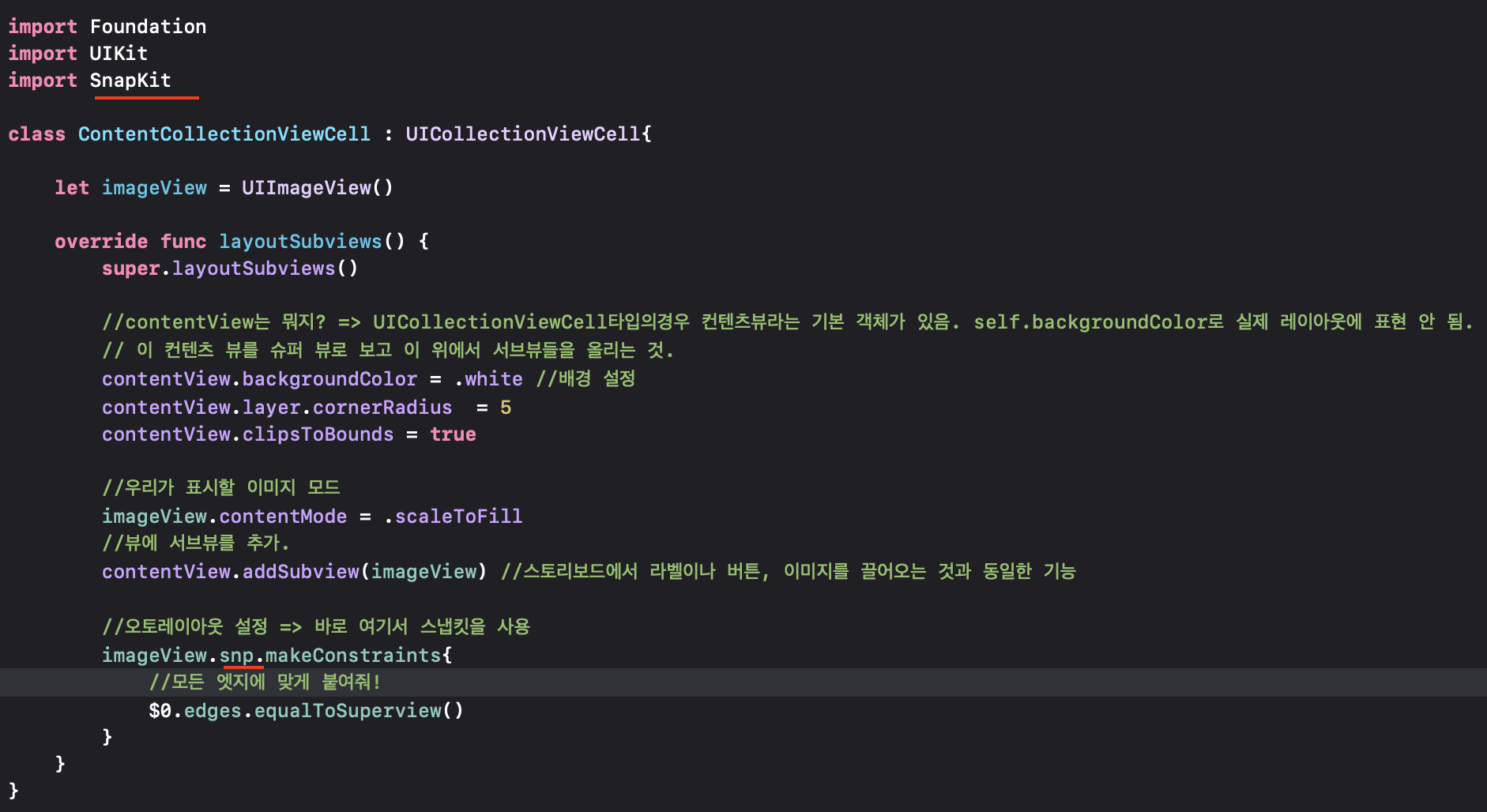 가장 처음에 컬렉션 뷰 컨트롤러를 만들 때 우리가 이 씬델리게이트에서 그냥 플로우 레이아웃 그냥 아무것도 우리가 설정하지 않은 플로우 레이아웃을 설정해줬지만 실제로 이제 뷰가 커지고 나면 각각의 데이터들을 가져올 거고 그 데이터들에 대한 내용으로 레이아웃을 새로 꾸며주는 거예요. 실제로 우리가 적용하고 싶은 속성을 추가한 거라고 보시면 됩니다.