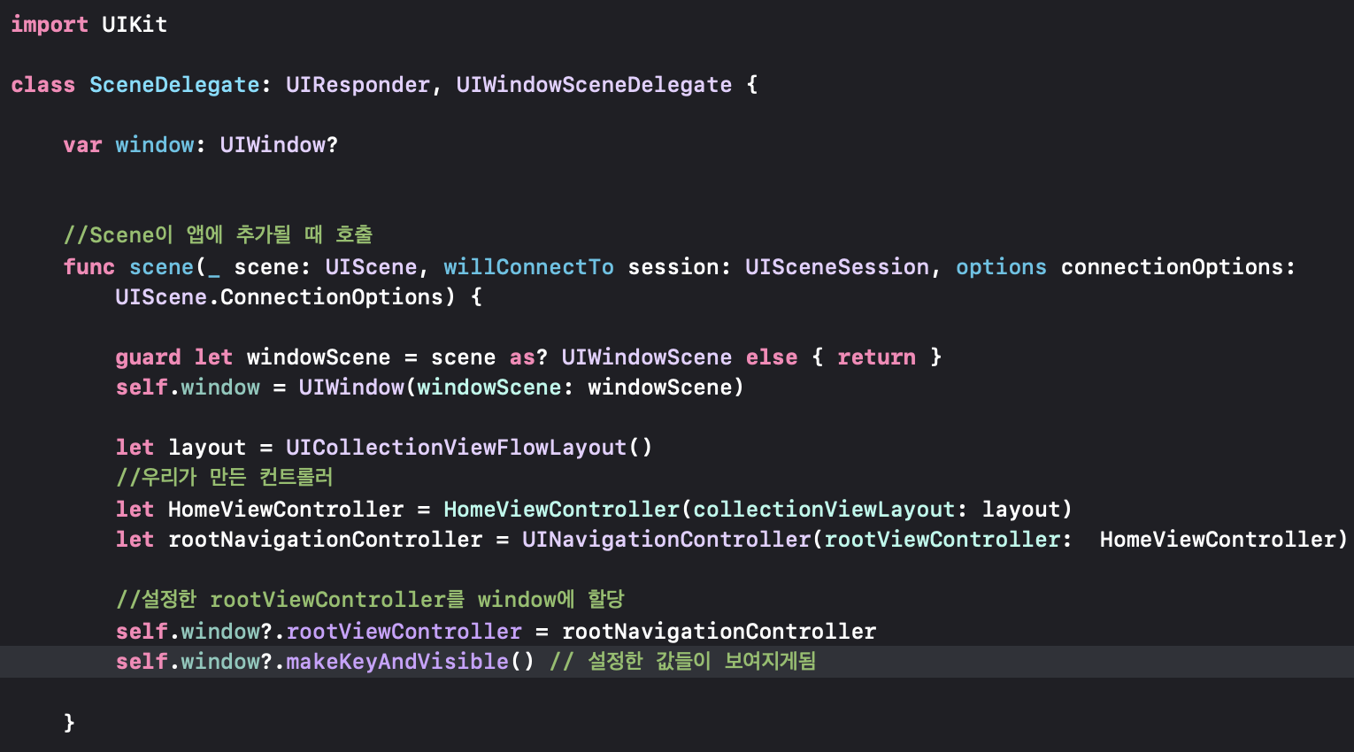 이제 이 뷰 컨트롤러를 인지하고 띄울 수 있도록 SceneDelegate에서 설정합니다.