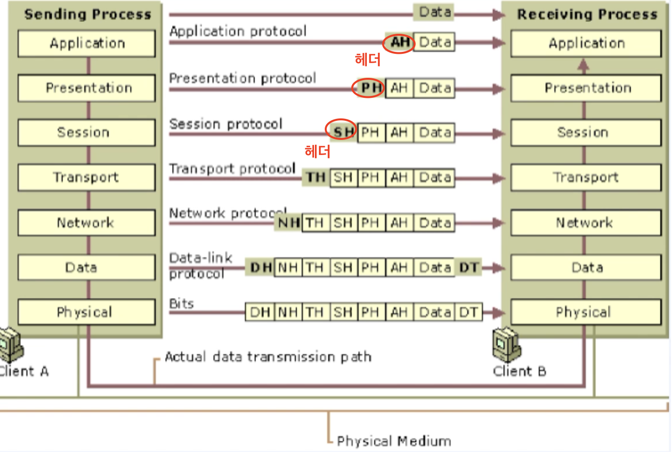 최상단 계층에서 하위 계층으로 전달될때 각각의 계층들이 인식될 수 있는 헤더를 붙이게 되는데