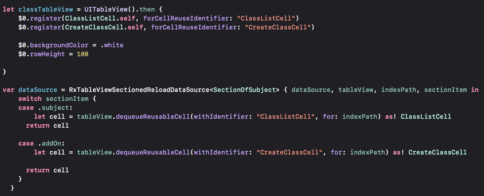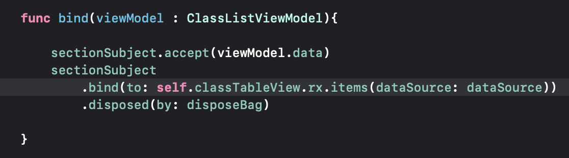 RxTableViewSectionedReloadDataSource로 구현하게되며 인자값은 Section모델을 넣어줌.