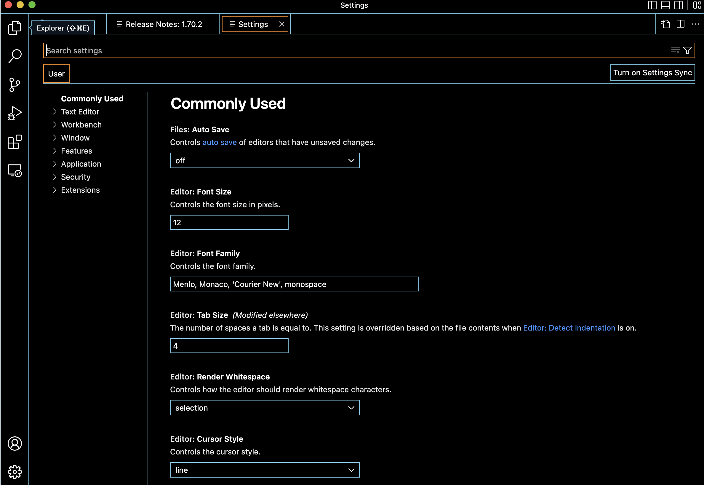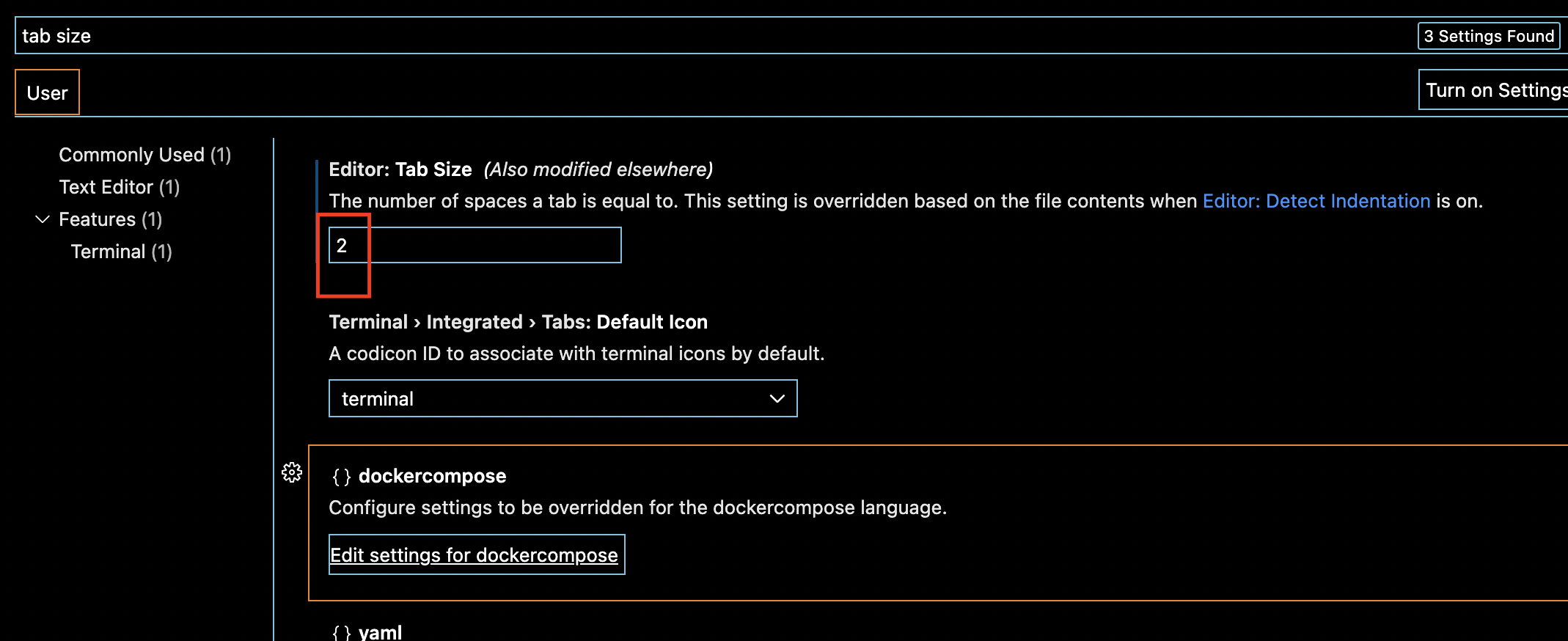 tab size를 검색하여 2로 바꾸어줍니다. 그 이유는 크기가 디폴트인 4로 되어있을 때는 오른쪽으로 많이 치우쳐지기때문이라네요.