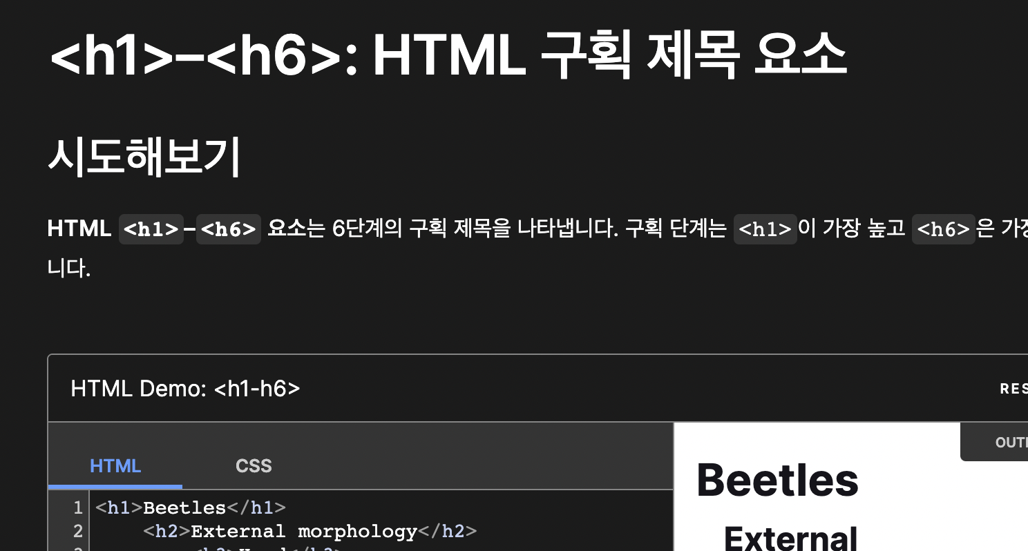 h1~ h6은 가장 큰 제목부터 작은 제목까지를 의미합니다.