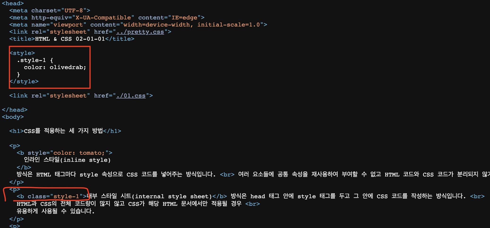- internal style sheet : head 태그 안에 style태그를 넣어서 적용, 그러나 코드가 길어지면 스크롤도 많이 해야하고 코드가 두배로 늘어남.
