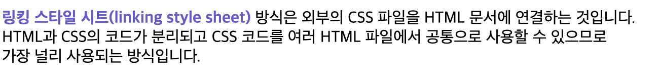 - linking style sheet : 외부의 CSS파일을 HTML문서에 연결해 적용.가장 널리 사용되는 방식