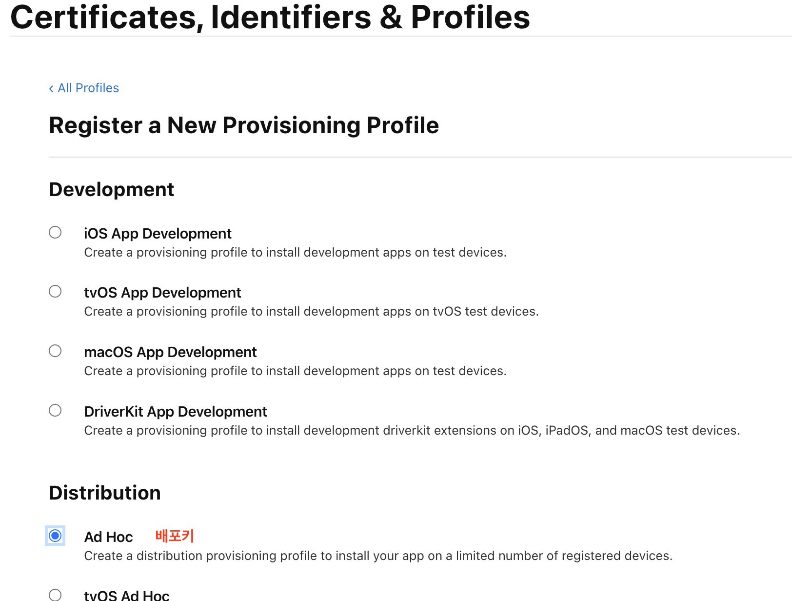 Certificates, Identifiers & Profiles 페이지(팀장 계정)로 이동합니다.